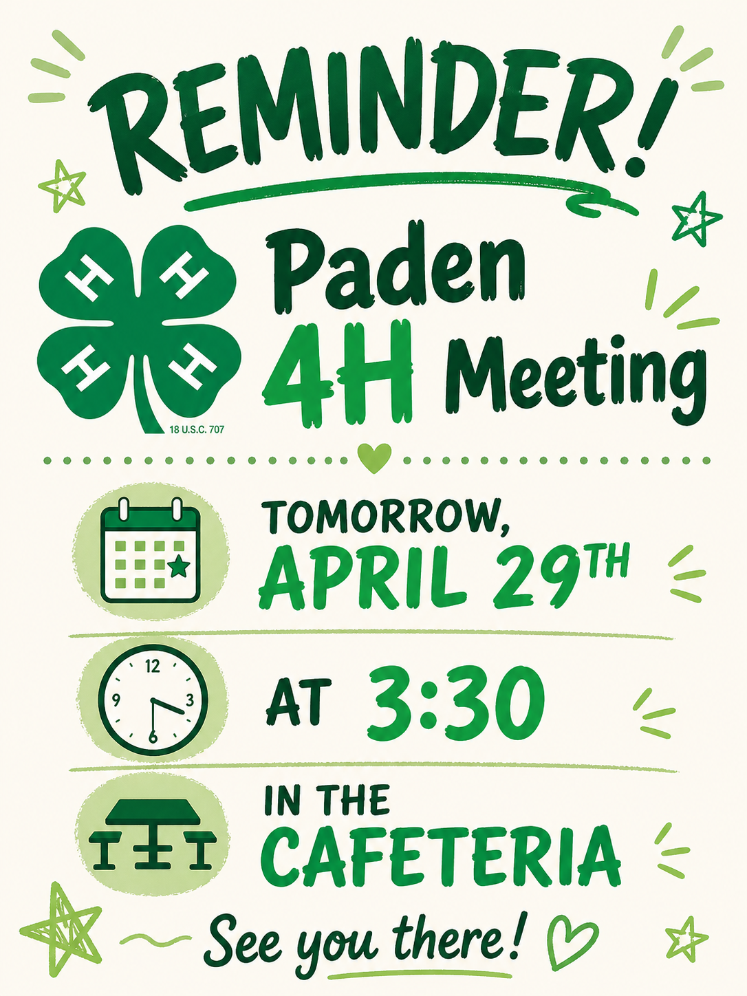 April 28, 2026 Change: 4H 🍀 Change of date and place: 4-H meeting will be Thursday at 3:30 in the ag barn. 🍀